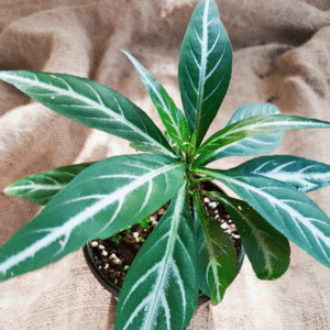 Anthurium ‘pigstail’ is a rare and striking tropical plant known for its distinctive, curly spathes that resemble pig tails. Near flowering, this plant produces vibrant blooms that add an exotic flair to any indoor space. It thrives in bright, indirect light and benefits from high humidity. With its lush, glossy leaves and unique appearance, anthurium ‘pigstail’ makes a perfect decorative piece for home or office settings. It’s a low-maintenance plant that requires regular watering and occasional feeding during its growing season. Known for its ability to purify indoor air, this anthurium variety is both beautiful and functional.