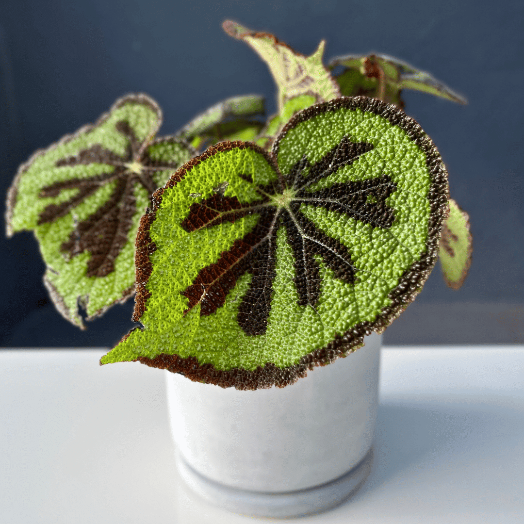Native to tropical regions, the begonia iron cross thrives in bright, indirect light and enjoys moderate humidity. Its textured leaves not only add visual interest but also make it a great companion plant in decorative groupings. When placed in the right environment, it can grow into a lush, bushy specimen, making it a striking centrepiece on tabletops, shelves, or plant stands.
