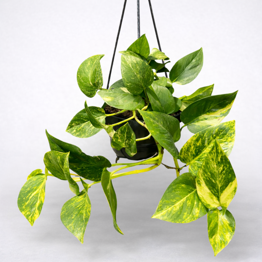 Lush Golden Pothos in an 18cm hanging pot. Easy-care trailing plant with vibrant green and yellow variegated foliage.