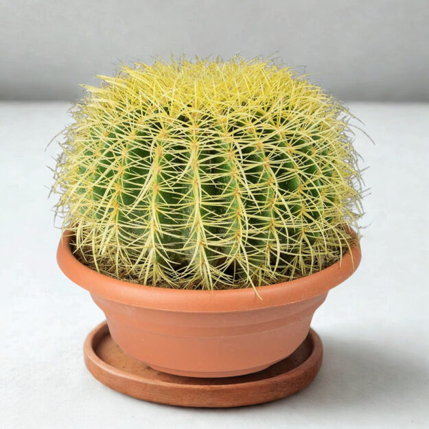 Golden Barrel Cactus in a 60cm pot. Large 45×45cm statement plant with striking golden spines. Drought-tolerant, low-maintenance, ideal for landscaping.