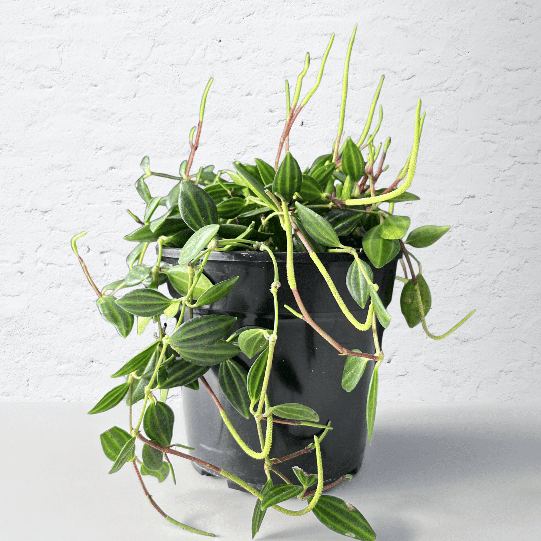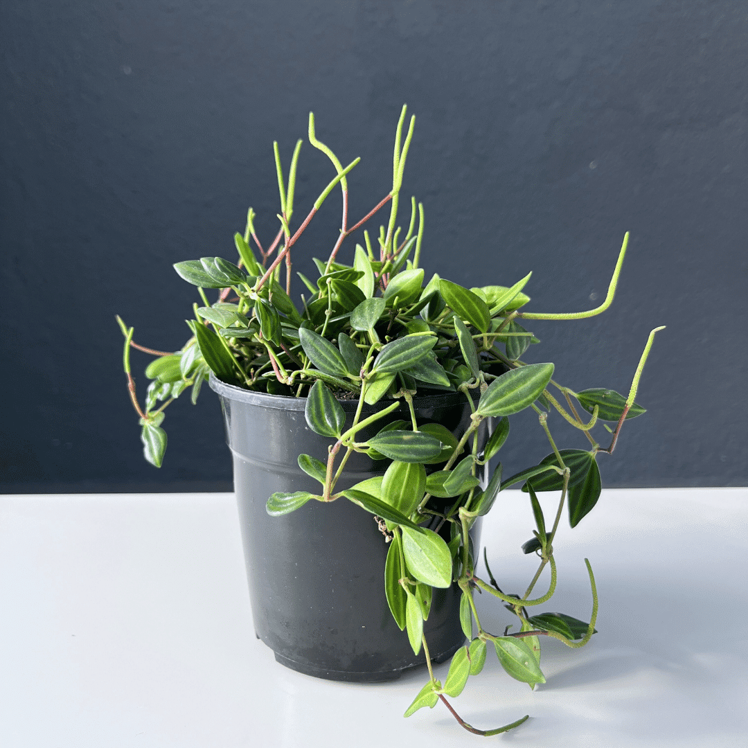 Pepperomia angulata with patterned foliage and trailing stems, perfect for indoor spaces. Low-maintenance and adaptable, it thrives in bright, indirect light or partial shade.