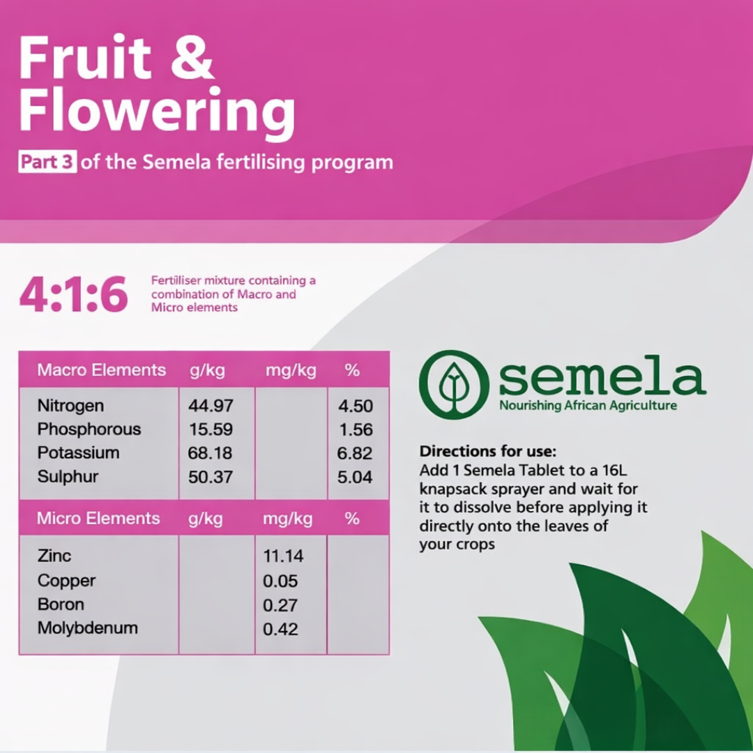 Semela Fruit and Flowering is a targeted water-soluble foliar fertiliser designed to maximise flower production, improve fruit set, and enhance overall crop quality. Rich in phosphorus and potassium, this formulation supports plants during their most demanding reproductive stages—flowering and fruiting.