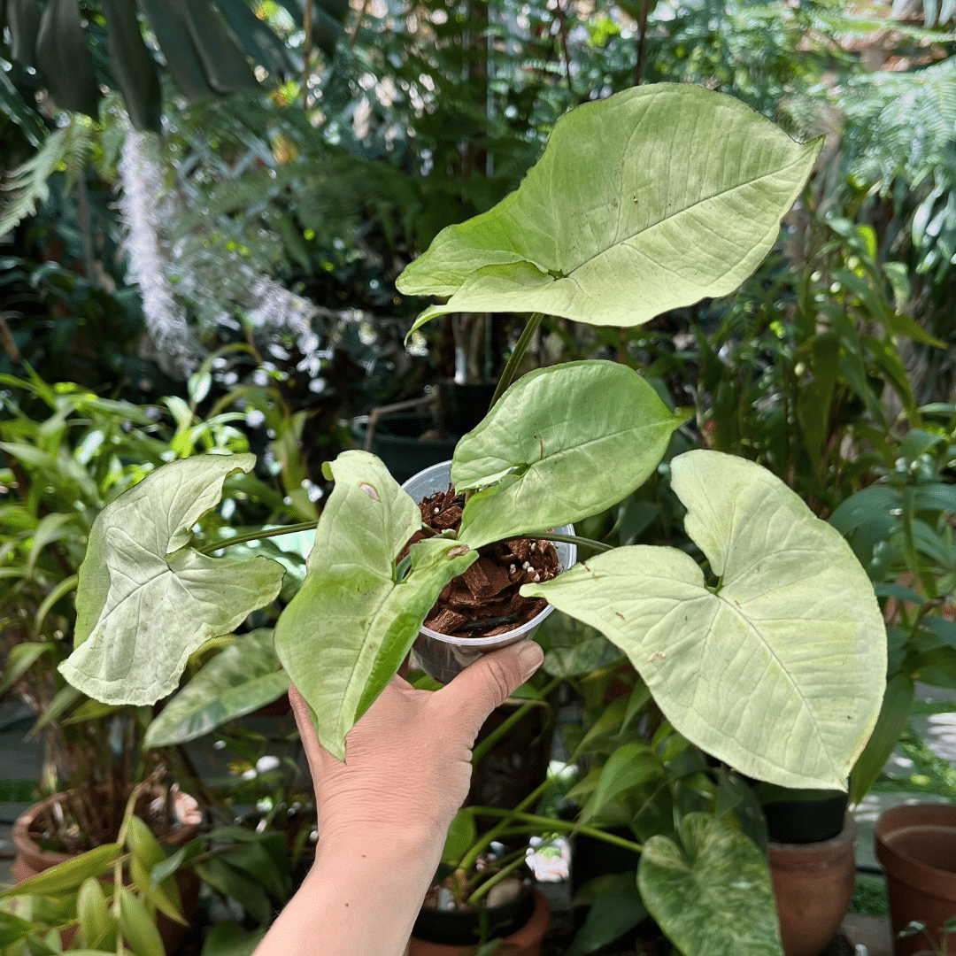 Syngonium podophyllum ‘moonshine’ features luminous, almost white, heart-shaped leaves with light green margins. Its bright, bushy foliage effortlessly enhances any space.